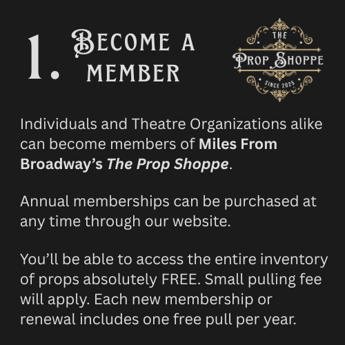 The pull fee covers the time required for someone to administer the prop(s) borrowed from The Prop Shoppe. A Miles From Broadway representative will meet you at our storage unit where you can pickup the prop(s). We will complete all necessary paperwork, document the state of the prop(s) borrowed and go over our expectations of handling while the props are in your care. Props are available on a first-come-first-serve basis.