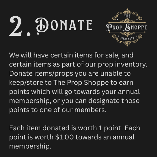 Individual Membership: Are you a props designer or independent producer? Become a member and you will have access to all props in our inventory. Any props you don’t have a place to store can be donated to The Prop Shoppe to earn points towards your annual membership.