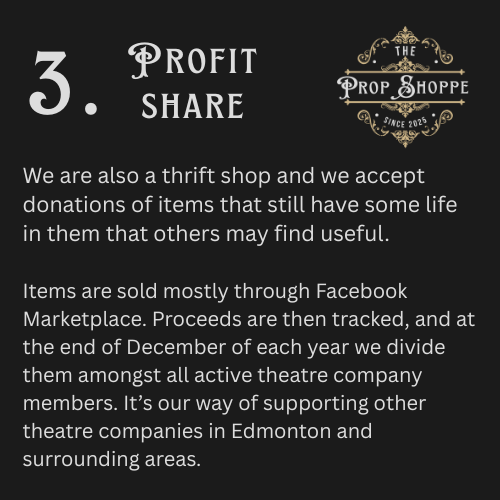 The Prop Shoppe is owned and operated by Miles From Broadway Society and is Edmonton’s newest theatre prop shop and thrift store that exclusively supports the Edmonton and surrounding area community theatre, independent and professional theatre companies.